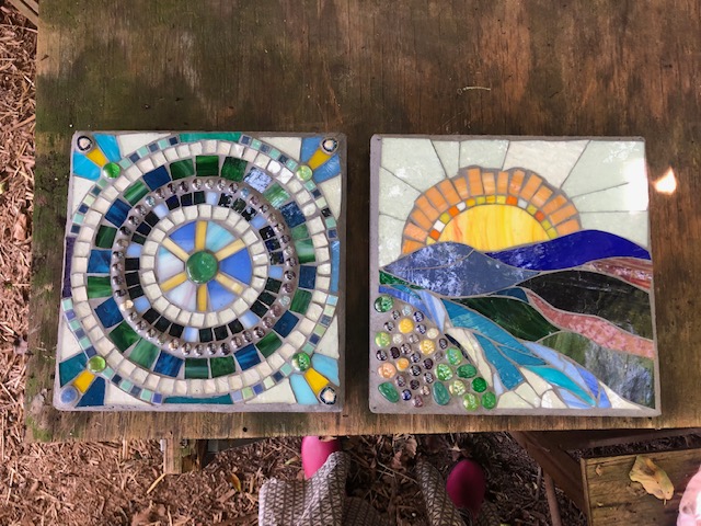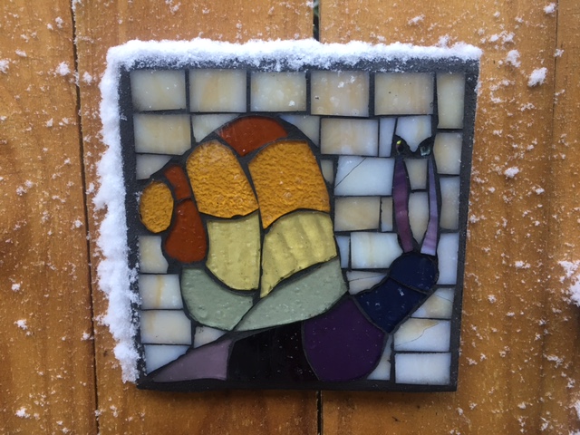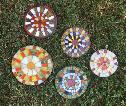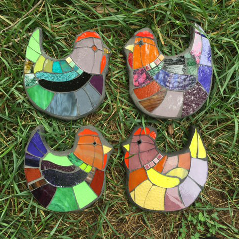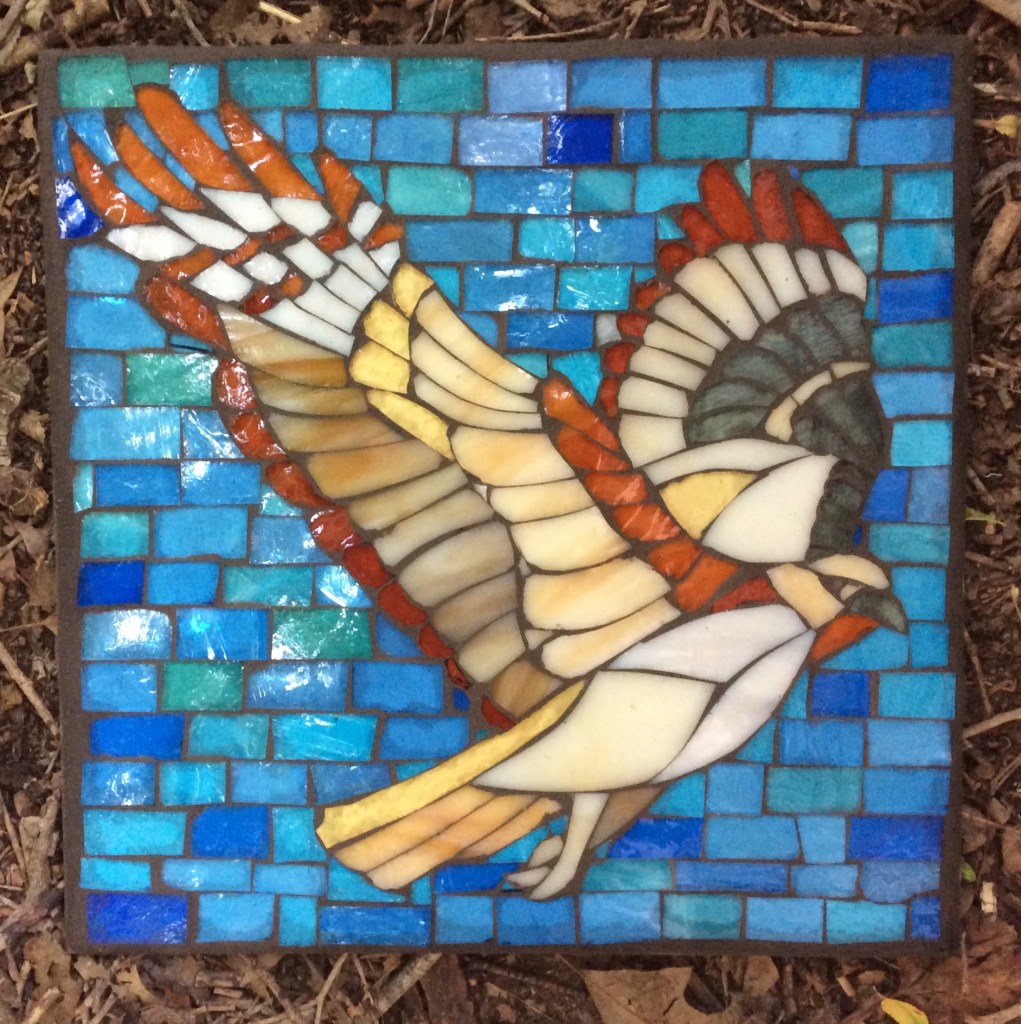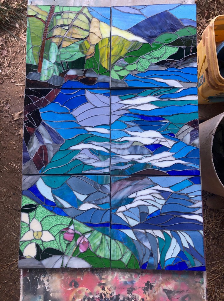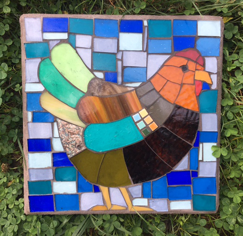 My mosaic work uses stained glass, cut by hand, mounted on concrete or tile board, and grouted with exterior grout. It is four-season friendly.