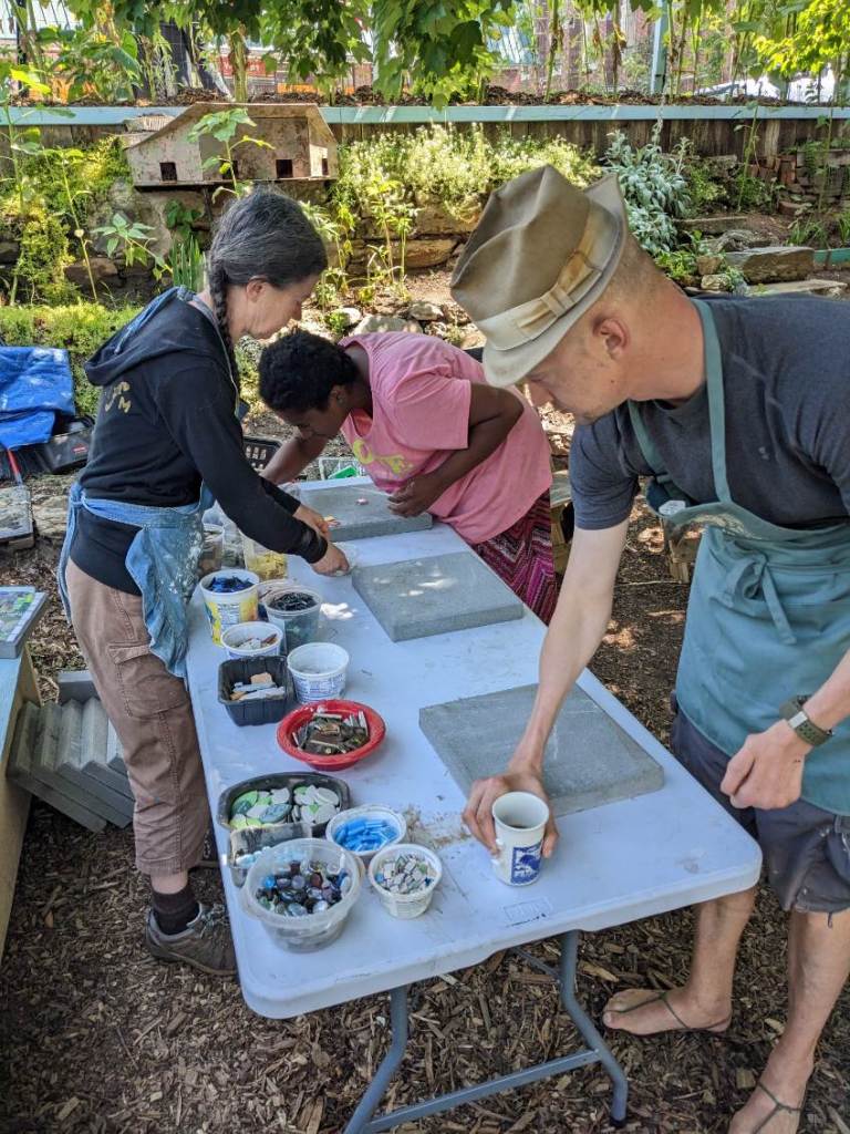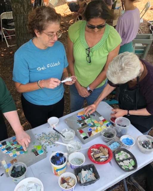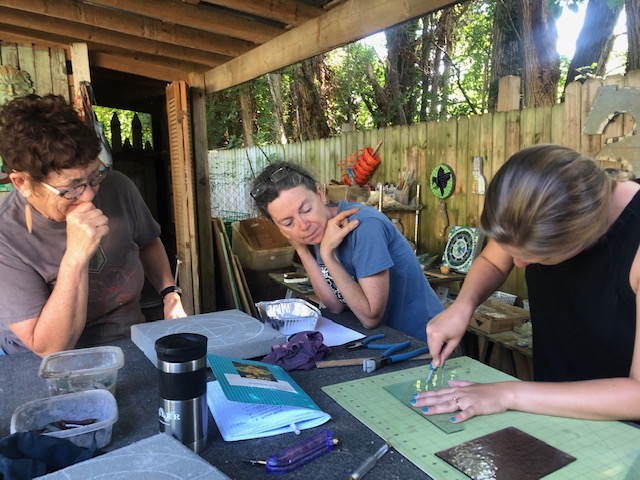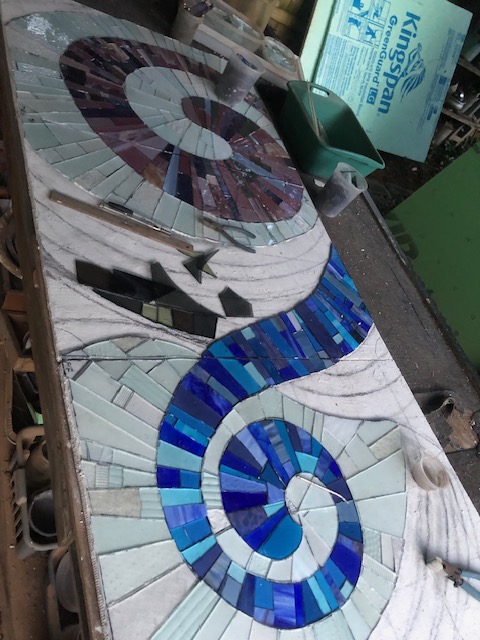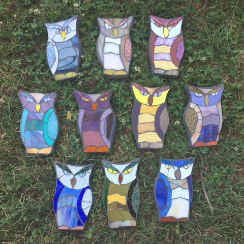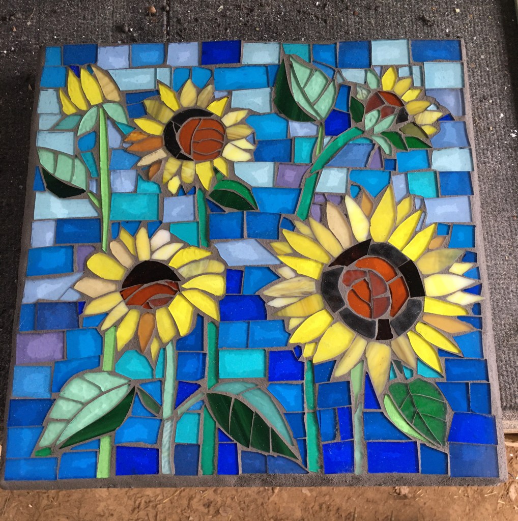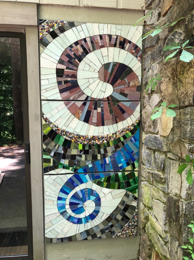 My mosaic work uses stained glass, cut by hand, mounted on concrete or tile board, and grouted with exterior grout. It is four-season friendly.