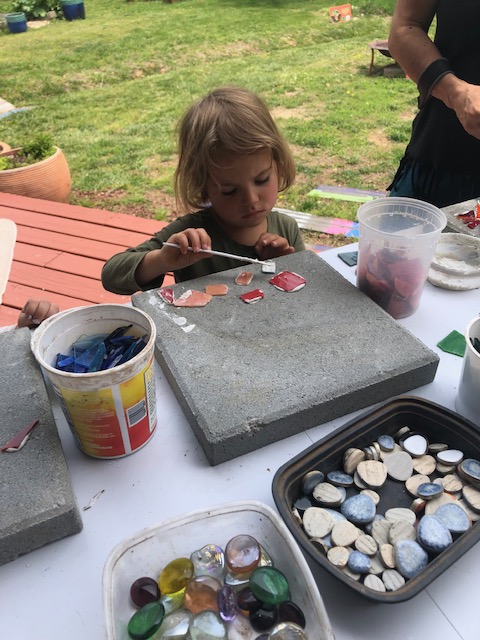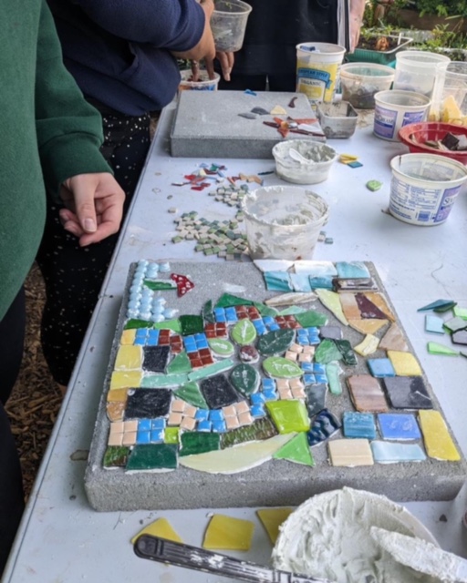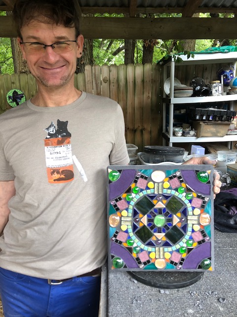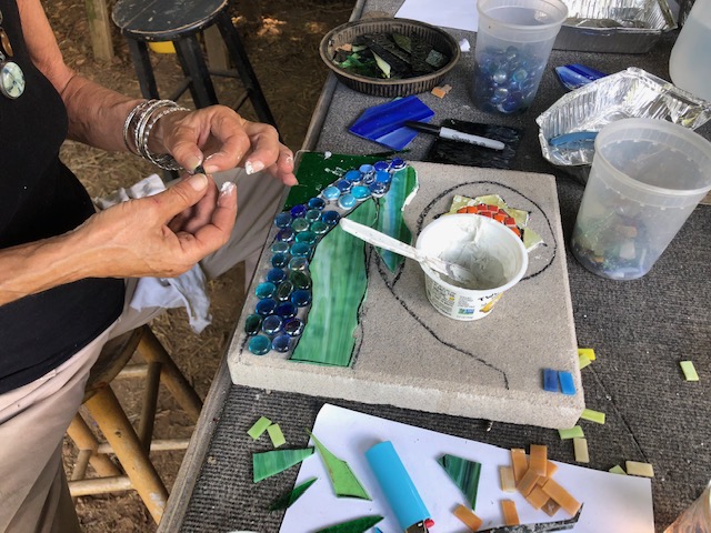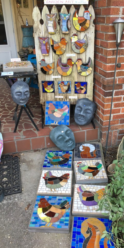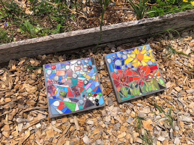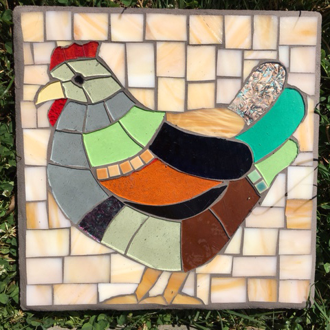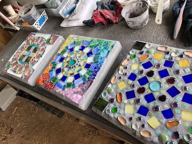 I started making mosaics in 2020 during the pandemic. Having a very small house, I decided to make things for my garden. I set up a workspace right next to my chicken coop!