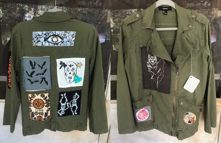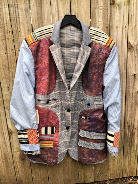 My upcycled collaged, painted, printed, embroidered jackets used to be found at the wonderful Sugar Britches, in downtown Asheville, but that special place is another Helene casualty. I’m working on finding a new place to put these.